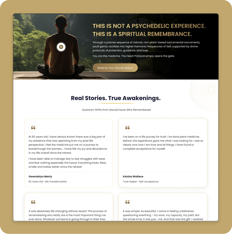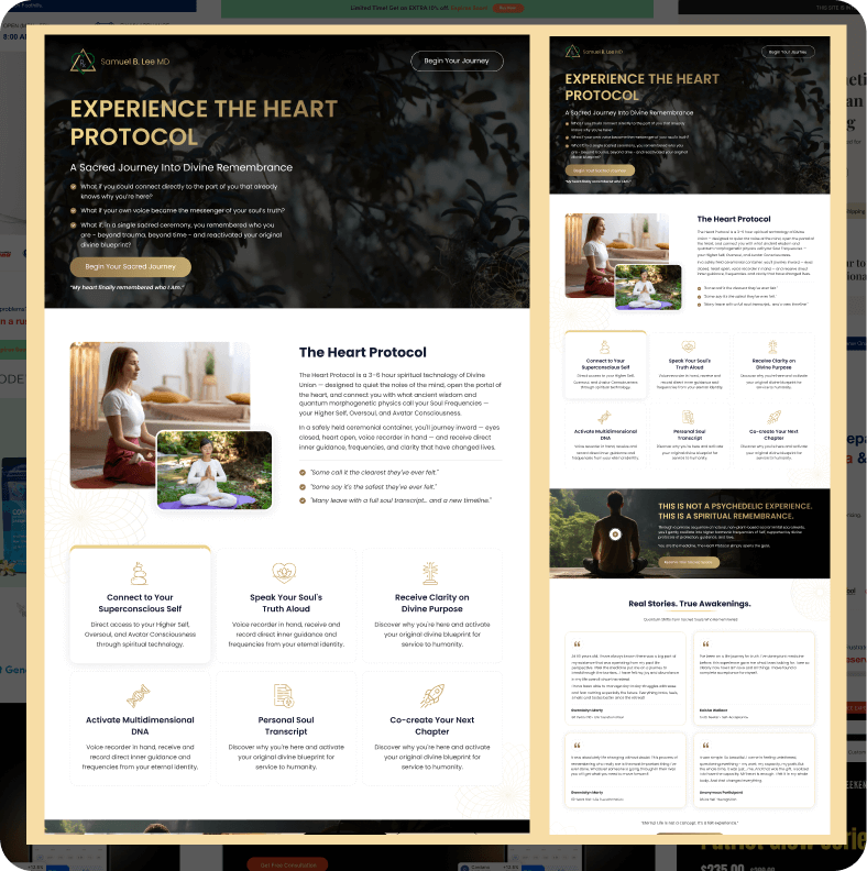 The Heart Protocol is a 3–6 hour sacred journey into Divine Union designed to quiet the mind, open the heart, and reconnect you with your Soul Frequencies: your Higher Self, Oversoul, and Avatar Consciousness.